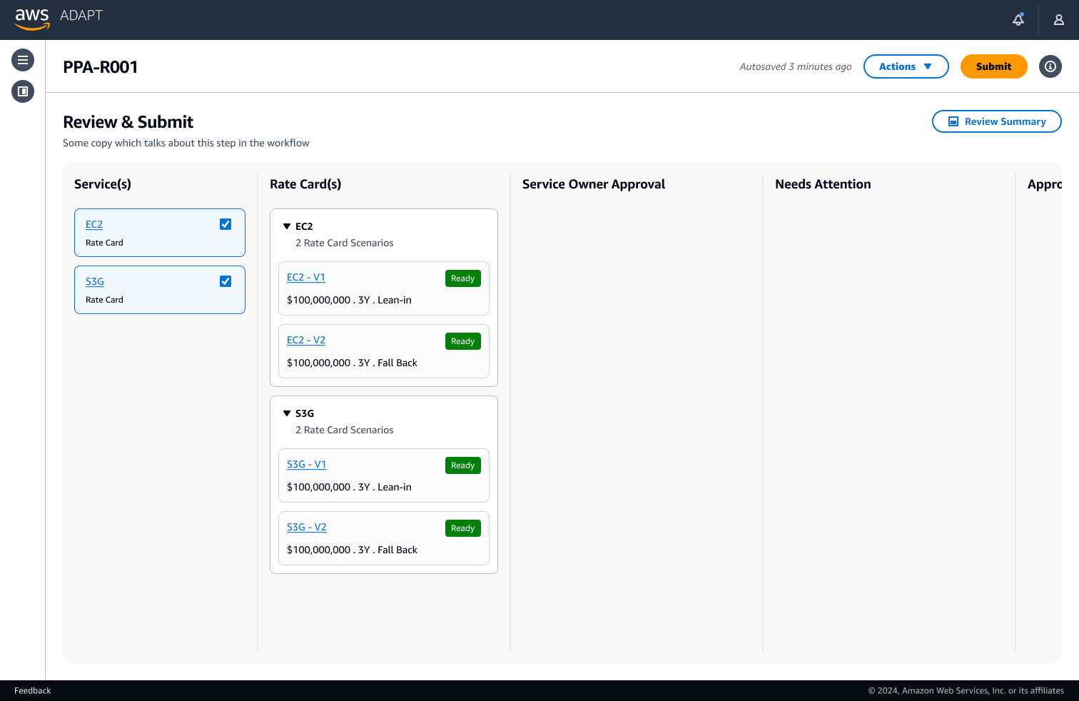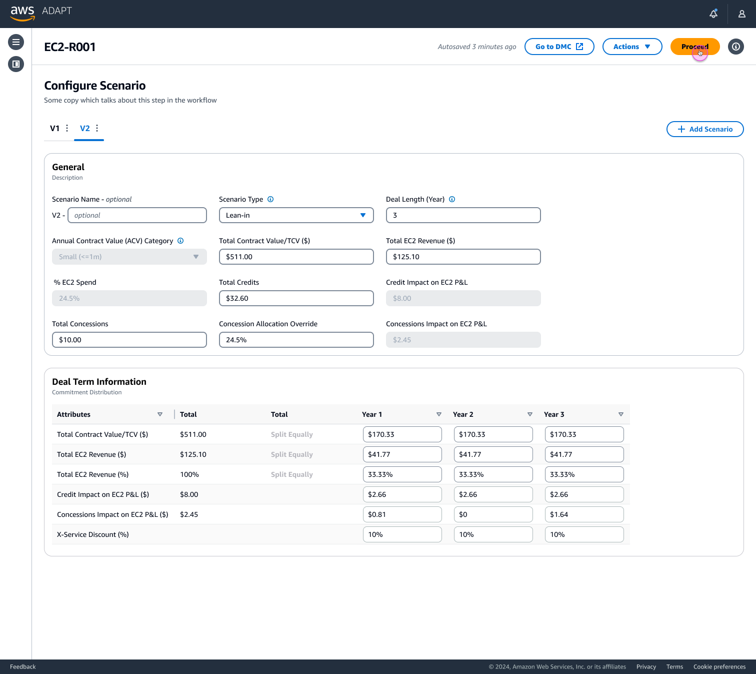 A streamlined and intuitive data intake workflow. This redesigned experienced reduced the number of steps and screen a user needed to complete in order to start the deal modeling process. We also added the ability to easily model multi-service deals which was a key feature missing for EC2 services.